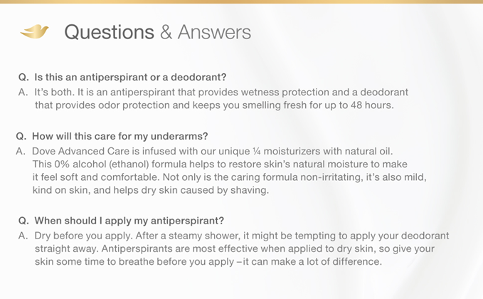 Infused with the fresh fragrance of crisp cucumber and honeydew melon blended with green tea, Dove Advanced Care Cool Essentials Antiperspirant Deodorant Stick is perfect if you’re looking for a long lasting, invigorating, and fresh scent. It's also a great choice if you're looking for a deodorant for sensitive skin. With an alcohol free formula that’s kind to skin, this deodorant helps to relieve the irritation that shaving can cause. Dove antiperspirant deodorant, enriched with our signature 1/4 moisturizers with natural oil, cares for your delicate underarm skin – leaving your underarms feeling healthy and protected. As much as it cares for your skin, this deodorant for women doesn’t compromise on effective antiperspirant protection. Keeping you fresh, this gentle deodorant protects from sweat and odor for up to 48 hours. For best results, apply this Dove antiperspirant deodorant to dry skin after showering and enjoy fresh, comfortably dry skin from morning to night. Dove is Certified Cruelty Free by PETA because we believe that real beauty is cruelty free. We’re on a mission to help women raise their selfesteem because we believe beauty should be a source of confidence, not anxiety. Dove Antiperspirant Deodorants deliver effective underarm protection and are kind to skin, so women can be free of underarm inhibitions and live beautifully unselfconsciously.