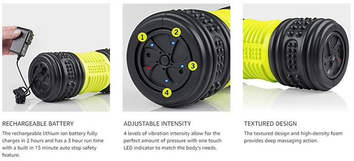 • FOAM ROLLER HAS 4 LEVELS OF VIBRATION INTENSITY to provide the right amount of pressure and massage intensity with a one touch LED indicator for lower back injuries, sciatica or plantar fasciitis