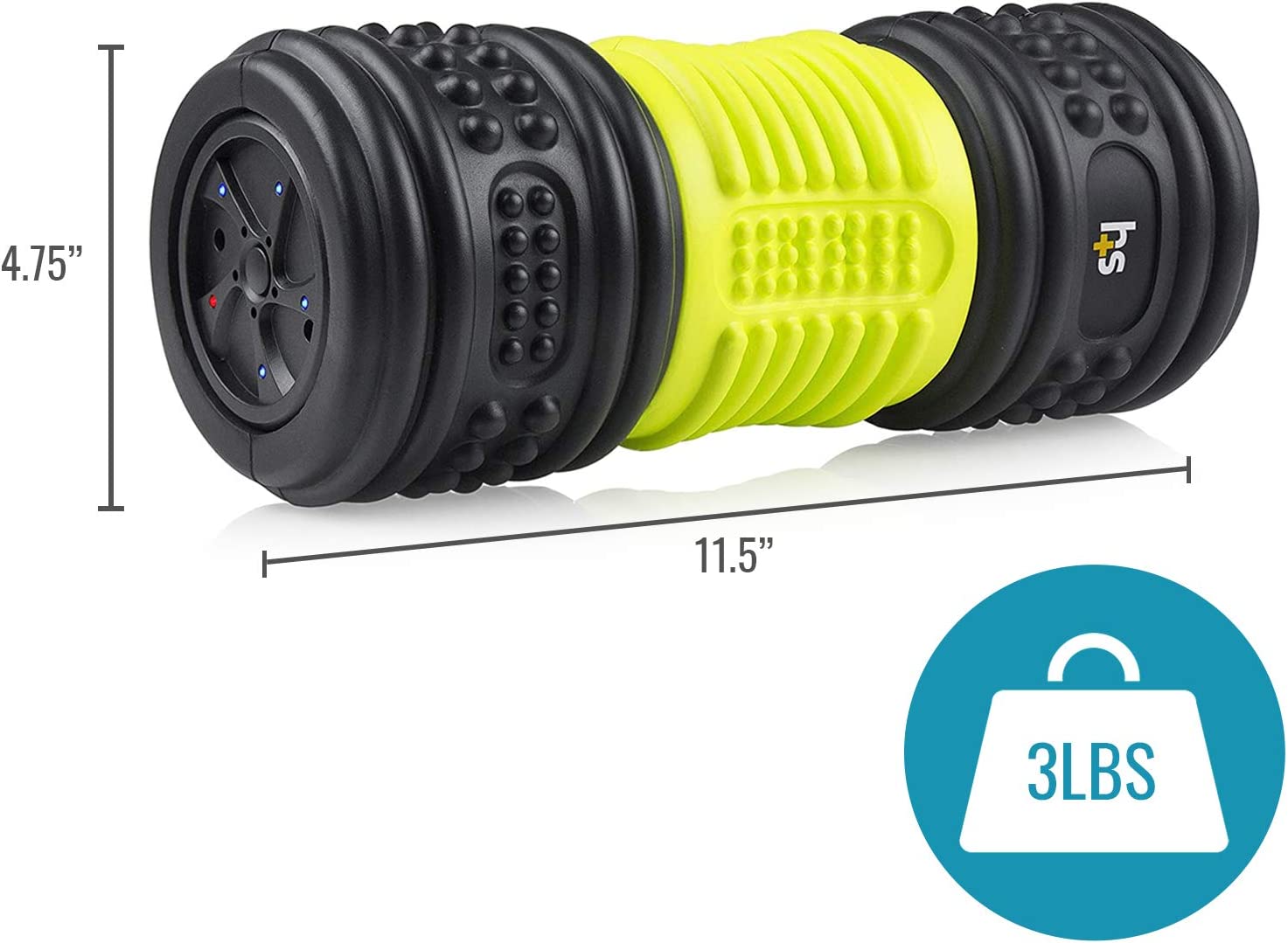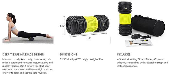• FOAM ROLL IS BATTERY POWERED and features integrated lithium ion batteries with an included AC wall charger. Roller measures 11.5 x 4.75 and weighs 3 pounds