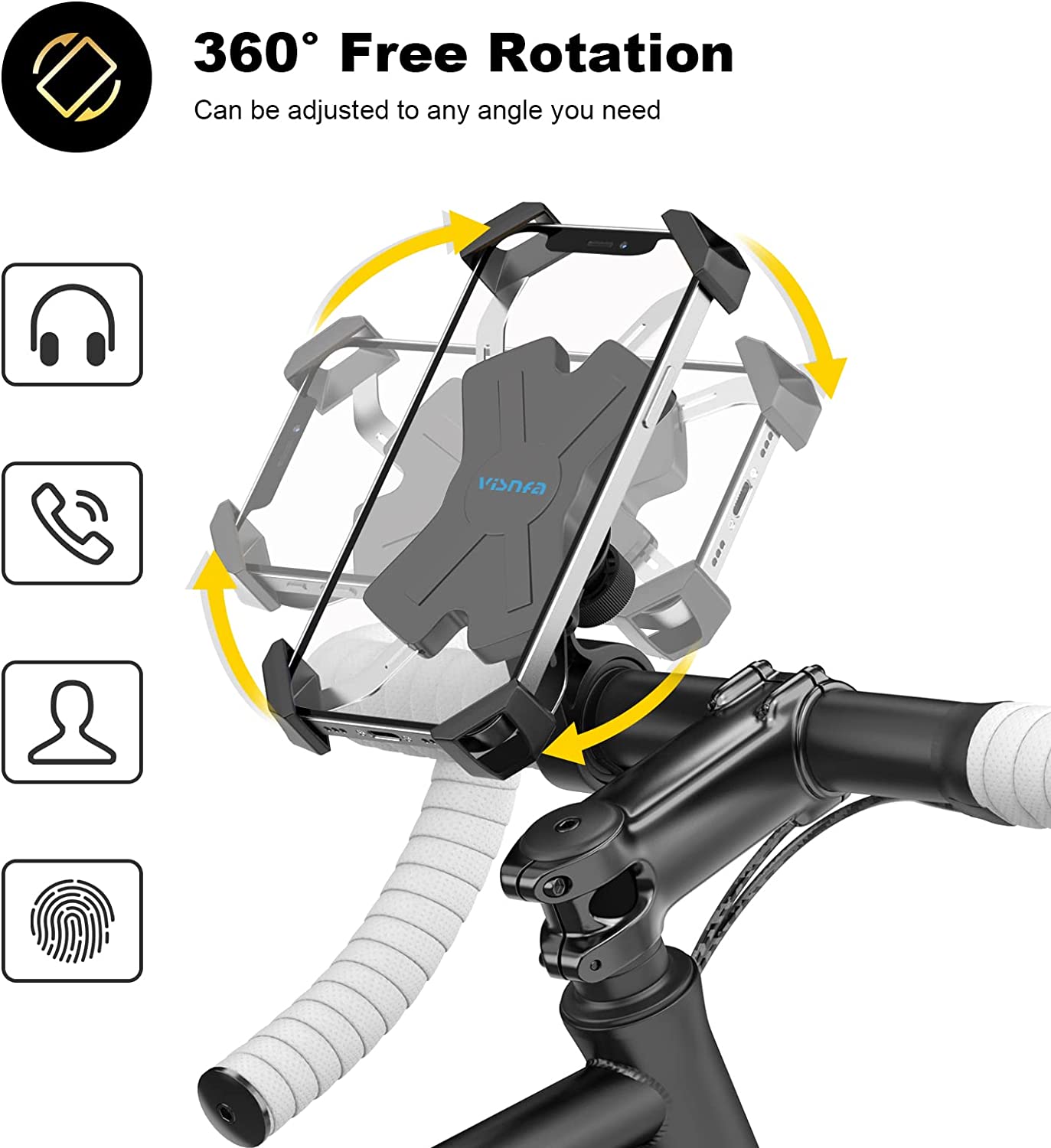 Rotation 360 Degrees: The phone holder and the handlebar connector are connected by a spherical universal joint, allowing you to adjust your phone to any angle you want!