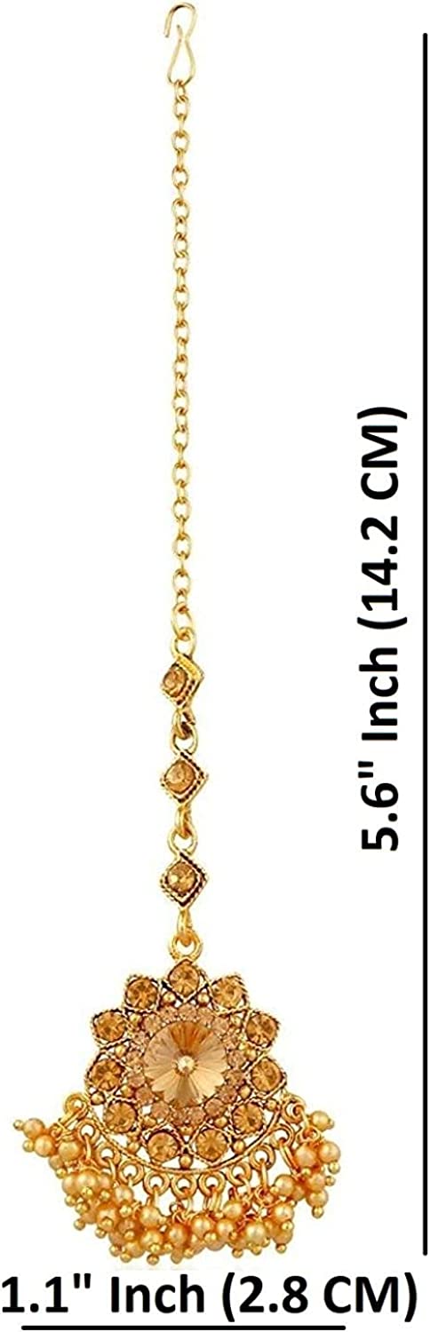 Content: 1) Inner Circumference/ Length: 8" Inch (20.3 cm), Necklace L x W: 16" Inch x 2" Inch (40.6 cm x 5 cm), with an adjustable soft tassel closure and it fits to neckline size 4.5" Inch (11.4 cm), 2) A pair of Dangle Earrings L x W: 2.2" Inch x 1.4" Inch (5.6 cm x 3.6 cm), 3) Maang tikka L x W: 5.6" Inch x 1.1" Inch (14.2 cm x 2.8 cm)