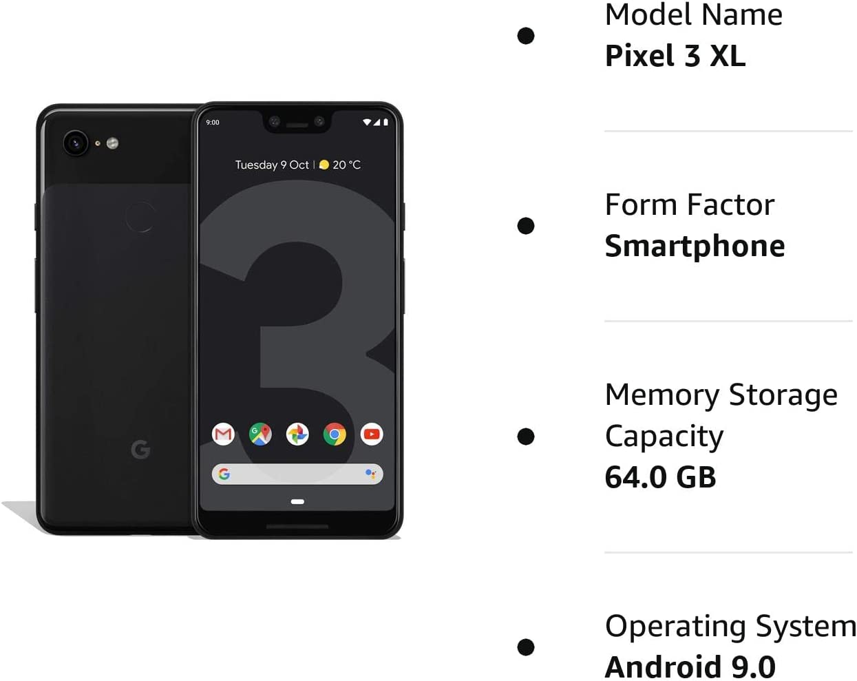 • Google Pixel 3 XL (64GB, 6.3in) Factory Unlocked US Warranty, Brand: Google, Model: Pixel 3 XL Factory Unlocked, GSM MPN: G013C, Operating System: Latest Android 9 Pie (3 years of OS and security updates), Cellular Band: Unlocked, Lock Status: Network Unlocked, Screen Size: Fullscreen 6.3 inches QHDplus OLED at 523ppi