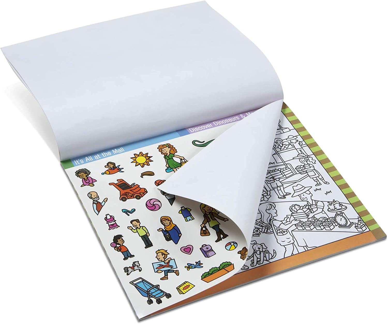 This fun pad is a seek-and-find game, a coloring pad, and a sticker pad all rolled into one! Match more than 400 full-color stickers to hidden objects on 14 town-themed pages, then color in the detailed scenes with pencils, markers, or crayons to create one-of-a-kind pictures. Sticker pages are color-coded and labeled to match scenes. The detail-rich scenes include a farmers market, hospital, highways, park, school, airport, amusement park, restaurant, mall, museum, café, construction site, bus station, and firehouse. Perforated edges make it easy to remove sticker pages to match to scenes.