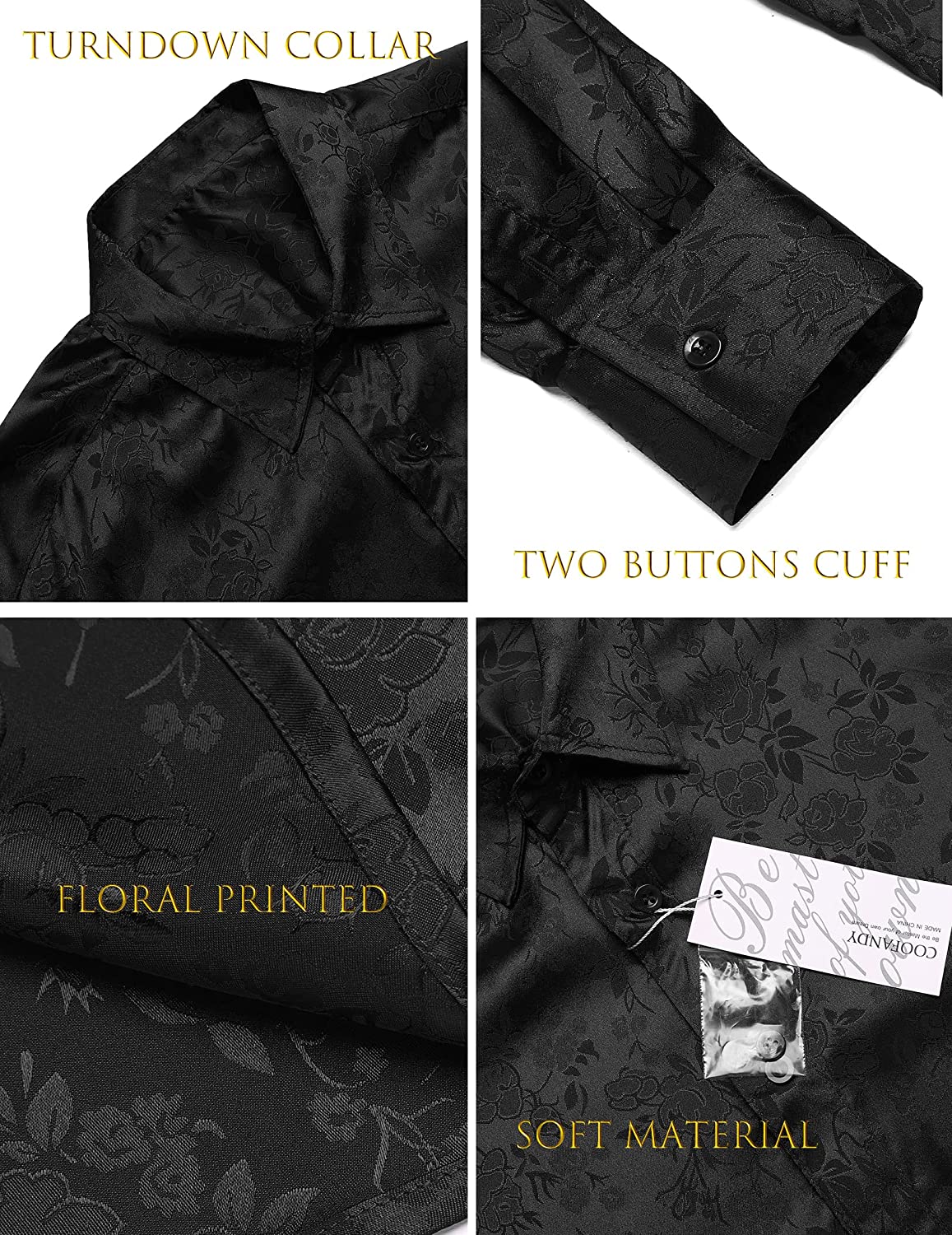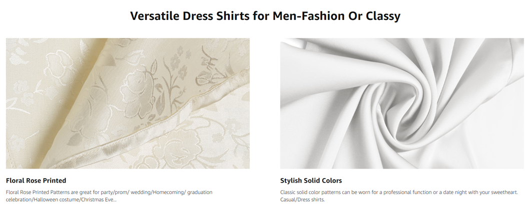 - Features- High Density Emulation Silk Fabric/Fashion print Floral/Soft decent Slim Fit/Bright Color/Turn Down Collar/Button-down Shirt. High Quality Fabric make this button down dress shirt smooth, shiny, soft and comfortable, stylish and luxury looking.