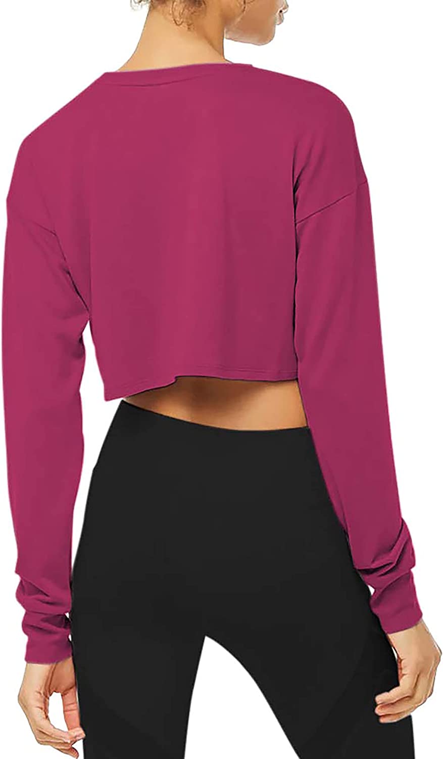 Long sleeve crop tops hit in between belly button and bottom of bra and is loose so it makes your waist look really tiny. If you mind too short, it is recommended to choose a larger size when buying. Of course, there are many people who prefer it crop.