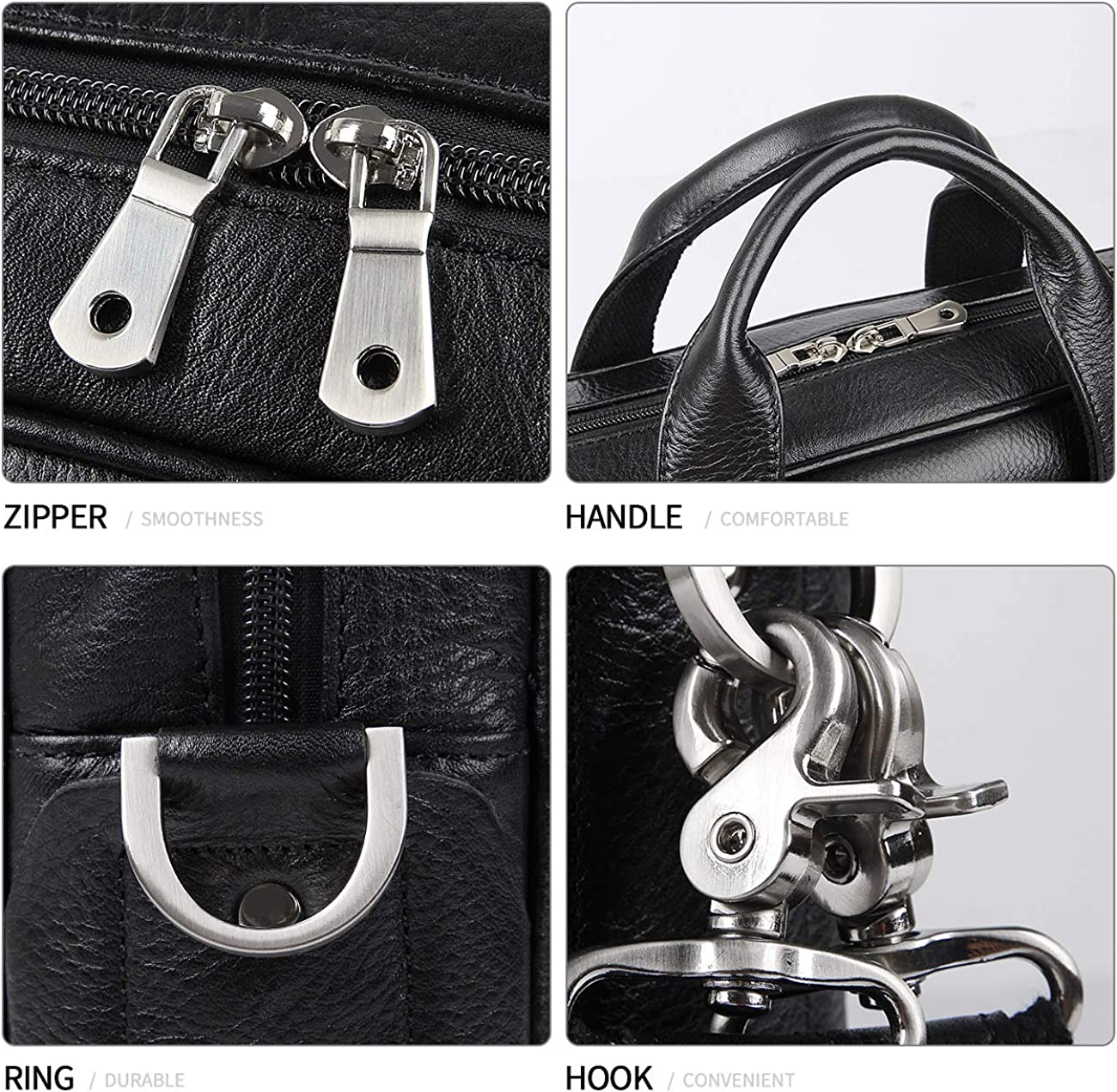- Material: 1. the leather: this Mens briefcase is made of 100% full grain leather. 2 . the zipper: We use high quality YKK Zipper explosion-proof material to ensure quality and reliability. 3. the Hardware: we use the one-time casting shaping, not splicing workmanship, we can ensure its durable for long time . 4. the lining: made of soft cotton cloth.