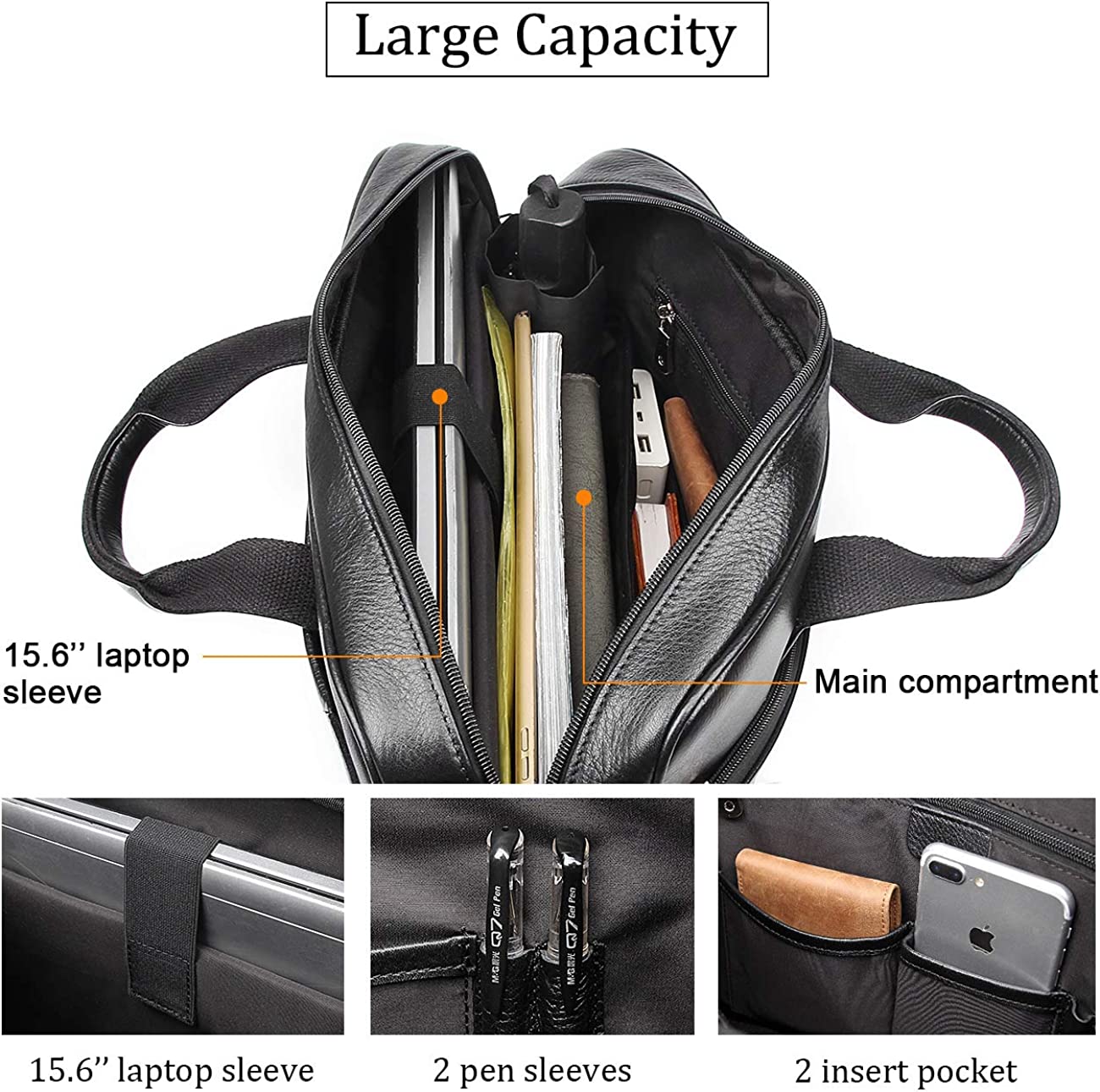 2) Inside 1 large central compartment and a padded pocket for safely carrying your 15.6" laptop, as well as smaller pockets for phones, keys, and your wallet, pen slots.