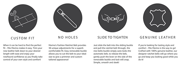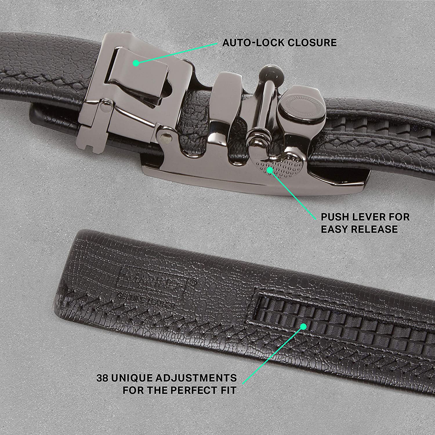 • AWESOME FUNCTIONS — The ratcheting belt that features absolutely no holes, real leather belt strap incorporates hidden ratchet track containing 38 unique adjustments welcoming this unique operation. Ratchet belts strap easy slides in to – LOCK. Gently click the lever on the side of buckle – OPEN.
