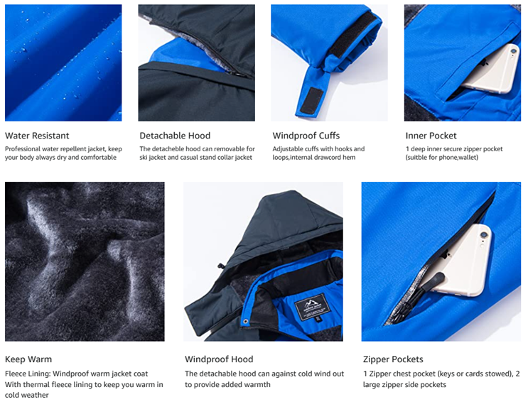 Adjustable cuffs with hooks and loops help seal in warmth,Professional water repellent jacket, keep your body always dry and comfortable