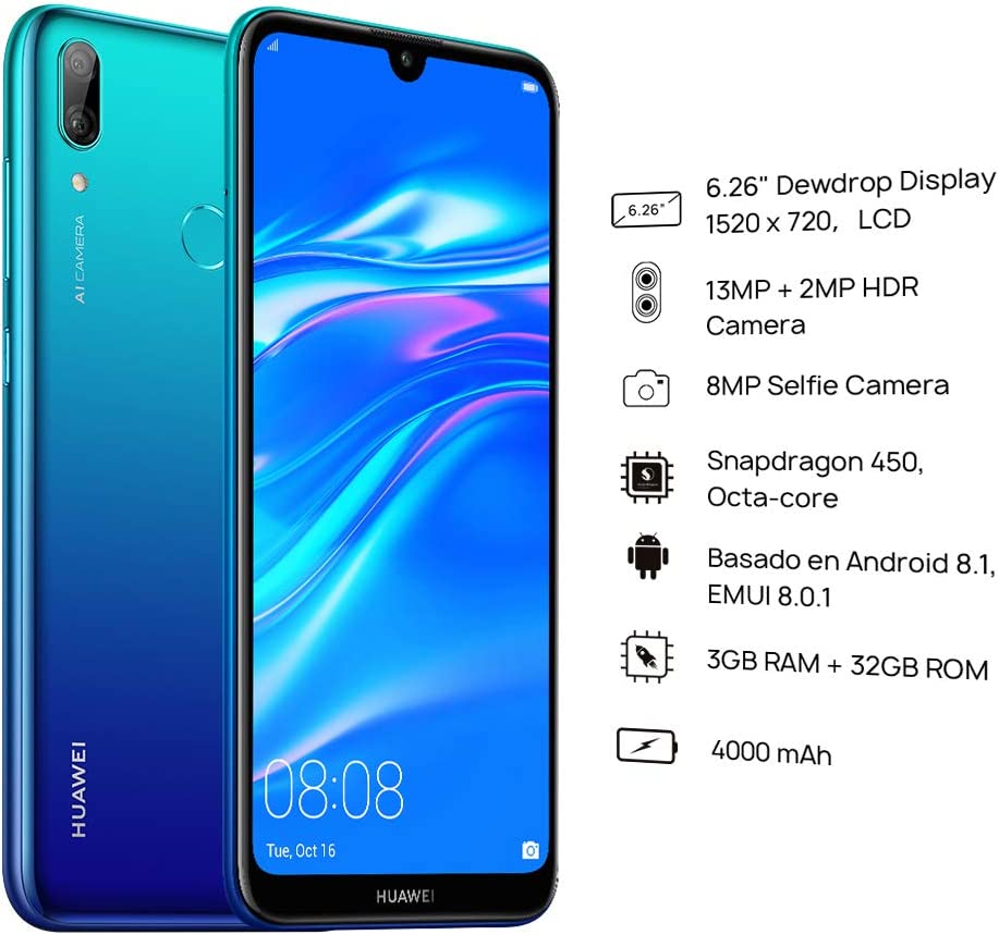 EXPAND YOUR VISION, EXPLORE THE FUTURE Wide Dewdrop Display A wide 6.26" Dewdrop display provides a clear and broader view for a better mobile experience. The 1520 x 720 HD+ IPS screen reveals greater saturation, more clarity and natural colours from any viewing angle. Now you have a colourful world in your hand. Classic Design The elegant and simple design of HUAWEI Y7 2019 reveals its beauty to the world. The curved rear cover with polished ceramic-like texture and smooth touch, gives you a unique and comfortable feeling in your hand. Available Colours: Aurora Blue, Coral Red and Midnight Black Perfect Selfies The 8 MP front camera features automatic retouching to deliver perfect photos. No need to edit your photos because your selfies are already tailored to reflect the most beautiful you. Dazzling Photography With the dual AI 13 MP + 2 MP rear cameras, you can easily recognise objects and get them more focused with greater light input thanks to the large f/1.8 aperture. The AI Camera can also intelligently recognise up to 500+ scenes with 22 labels in real time, so every photo will be optimised in real-time. Large Battery The impressive 4000 mAh1 battery with AI power saving technology makes you travel worry-free and enjoy life without stopping to frequently recharge. Intelligent Performance The efficient and intelligent Qualcomm 450 Octacore chipset2 with 3 GB RAM + 32 GB ROM delivers a smooth experience while you are running multiple apps. The HUAWEI Y7 2019 supports up to 512 GB MicroSD card3 to store whatever you need. Unlock with a Glance Face Unlock 2.0 can quickly unlock from multiple angles for a conveniently safe and secure way to protect your information. Unlock your next adventure with a glance. Easy Mode The larger font, bigger icons and louder volume in Easy Mode provide a better experience for those who need it. The simplified interface will make navigating the phone stress-free and easy to understand.