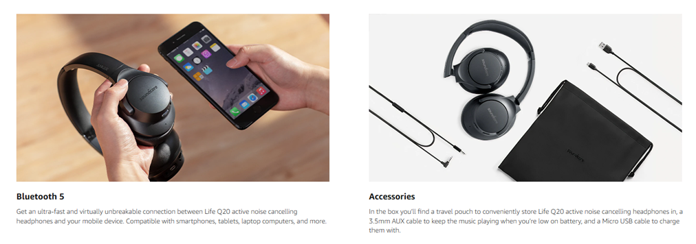 • 40-Hour Playtime*: Up to 40 hours of non-stop playtime in wireless active noise cancellation mode (at 60% volume) is extended to an enormous 60 hours in standard music mode. A single charge gives you enough juice to listen to over 600 songs or soundtrack multiple long haul flights. And when you’re in a rush, charge Life Q20 active noise canceling headphones for 5 minutes and get 4 hours of listening.