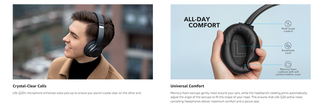 40-Hour Playtime: Life Q20 active noise canceling headphones power multiple long haul flights from a single charge with up to 40 hours of playtime in wireless ANC mode. Increase to 60 hours in standard wireless listening mode.