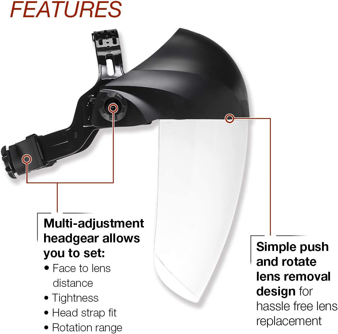 SUPERIOR COMFORT - Cushioned front and back headband eliminates pressure points and evenly distributes face shield weight. Unique shell & lens profile contours to the head and neck to deflect impacts.