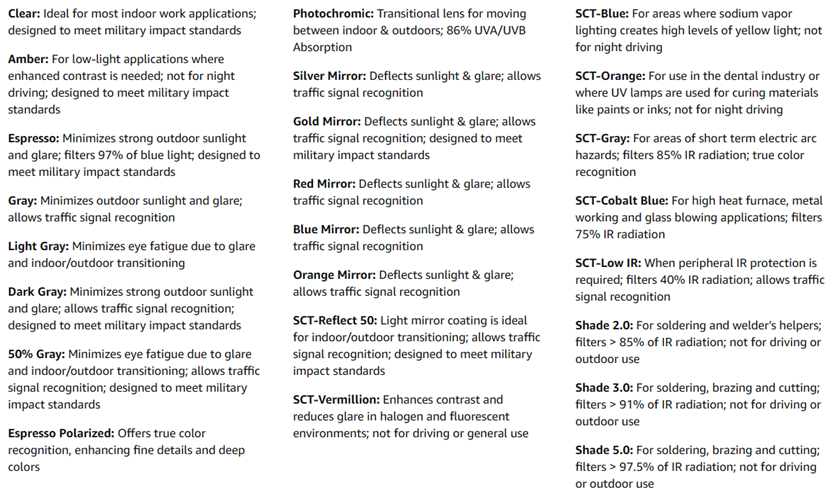 Uvex Genesis Safety Glasses are engineered for comfort, protection and style, Our Genesis line is the number one selling premium protective eyewear in the market, delivering an incredible range of superior product benefits. Built with MMT (Multi-Material Technology), these safety glasses offer the highest available impact safety: military V0 ballistic test protection against impact energies 7X higher than ANSI requirements (on select tints). They are also certified to meet CSA Z94.3 standards. Some models also feature an advanced TPE frame formulation that performs exceptionally well in environments where chemical mist, cutting oils and high moisture are present. The wraparound 9-base uni-lens offers excellent side coverage and peripheral vision, and the adjustable temple length & lens inclination makes for a truly customized fit. Unique comfort features include a soft elastomer browguard to diffuse impacts, and soft, flexible nose fingers that reduce slippage and conform to almost any nasal profile. A ventilation channel between the frame and lens vents the eye socket area to deliver an outstanding level of moisture and fog control. Genesis safety eyewear also boasts an easy and economical lens replacement system to extend the life of your glasses. Uvex Genesis Safety Glasses are available with multiple lens tints to suit almost any work environment. Uvex stands for "Ultra Violet Excluded", which means our safety glasses employ specifically formulated resins that filter 99.9% of the UV radiation in accordance to the U6 scale of the Z87 standard. Uvex has also developed Spectrum Control Technology (SCT), which incorporates unique dyes designed to absorb select wavelengths of radiant energy (light). Our anti-glare glasses, tinted safety glasses and safety sunglasses are designed to manipulate light to reduce a spectral hazard, or to provide distinctive filtration for specific safety eyewear viewing tasks. Examples include filtering solar radiation to reduce glare, and blocking radiation from welding to protect workers around these operations. Multiple anti-fog and anti-scratch coatings are also available. The new HydroShield technology provides our best anti-fog lens coating, keeping your vision clear up to 90X longer than most other competitive anti-fog safety glasses. The Uvextreme anti-fog coating offers great, dual-action performance under demanding hot and humid conditions for long lasting fog-free performance. Our Ultra-Dura hardcoat makes for some of the toughest scratch-resistant safety glasses in the world. Permanently bonded to the lens, it offers unparalleled scratch and chemical resistance. The dual anti-fog/anti-scratch Dura-Streme coating combines the benefits of our industry-leading Uvextreme anti-fog coating and our Ultra-Dura anti-scratch hardcoat. While the advanced anti-fog properties of Uvextreme help keep the interior of the lens clear from fogging, the rugged properties of Ultra-Dura protect the exterior of the lens from scuffs and scratches, adding up to three times more life to lenses.