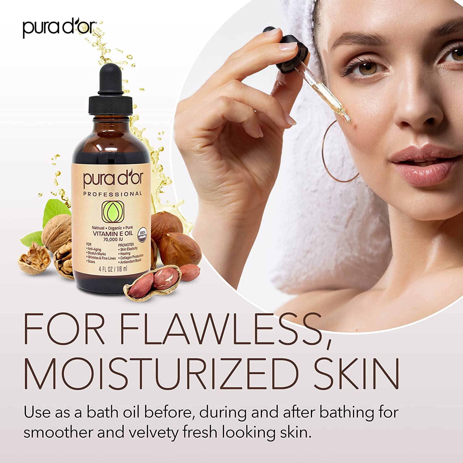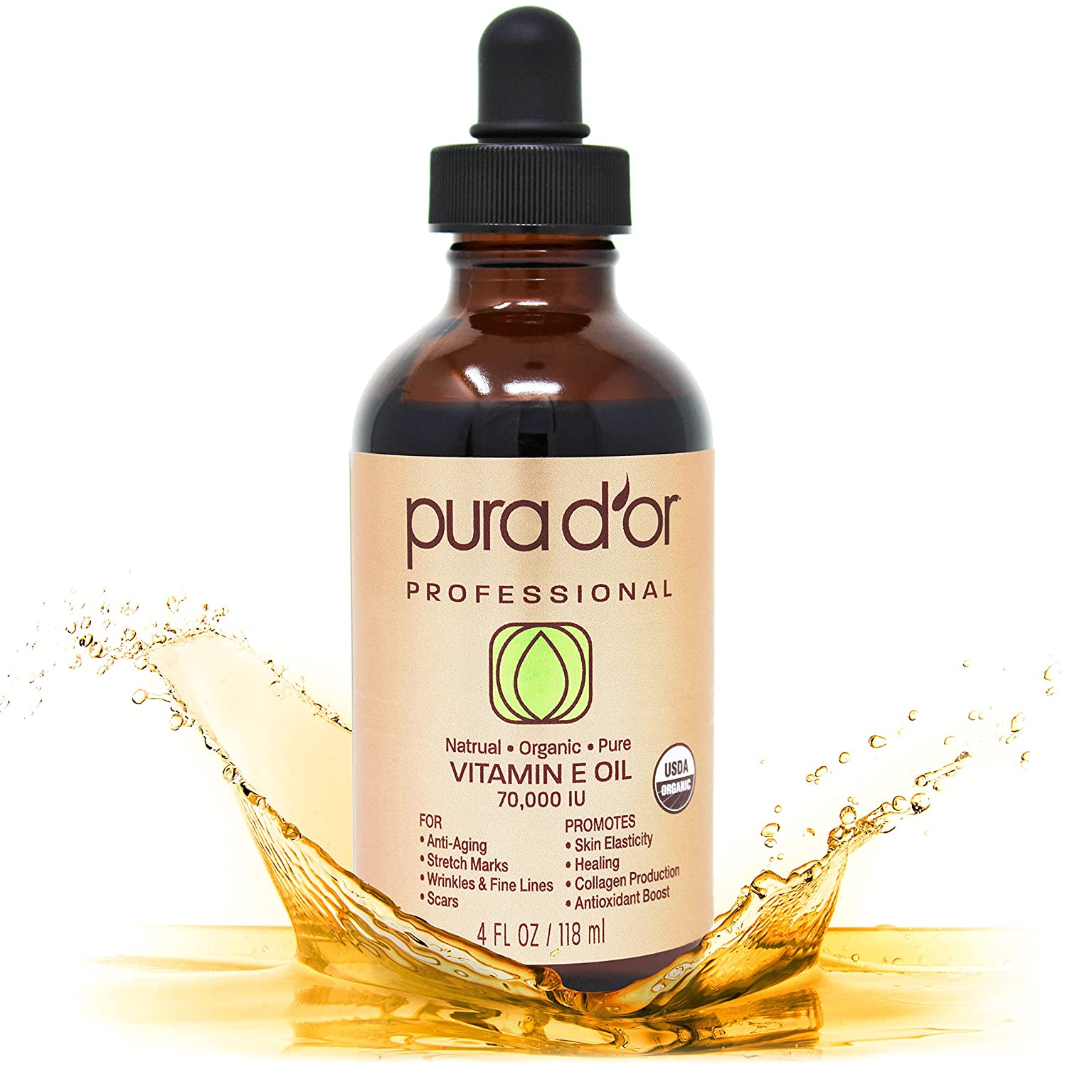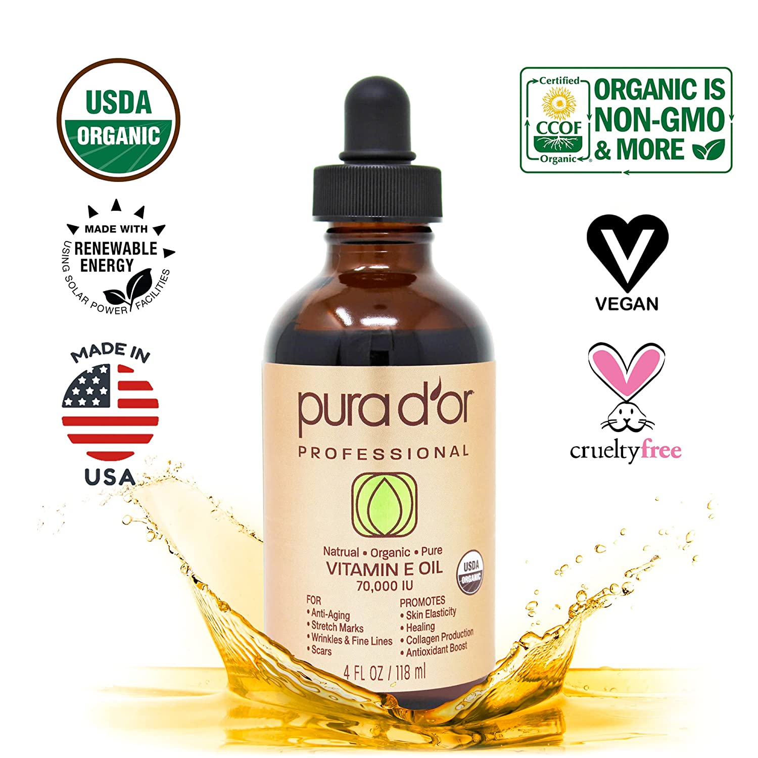 PURA D'OR Organic Vitamin E Oil Blend 70,000 IU (4oz / 118mL) 100% Natural Hexane Free, Sweet Almond, Apricot, Jojoba, Argan, Rosehip, Sunflower & Avocado Bath Oil for Scars, Skin, Face & Full Body