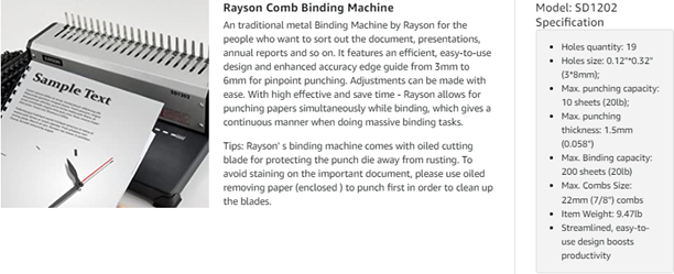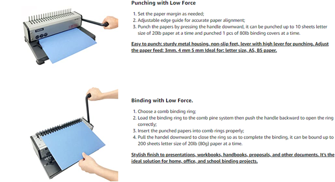 • Manually punch up to 10 sheets of 20lb (80g) paper at a time. And binds up to 200 sheets (letter size) of 80 gsm (20lb) paper with a 22mm (7/8") comb ring.
