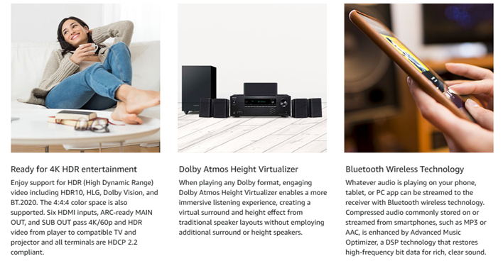 - FEATURES. Support for HDR (High Dynamic Range) video, 4K/60p and HDR (HDR10, hlg, Dolby vision, BT.2020). Discrete high-current analog amp system with 4-Ohm drive capability. 155 watts per Channel.