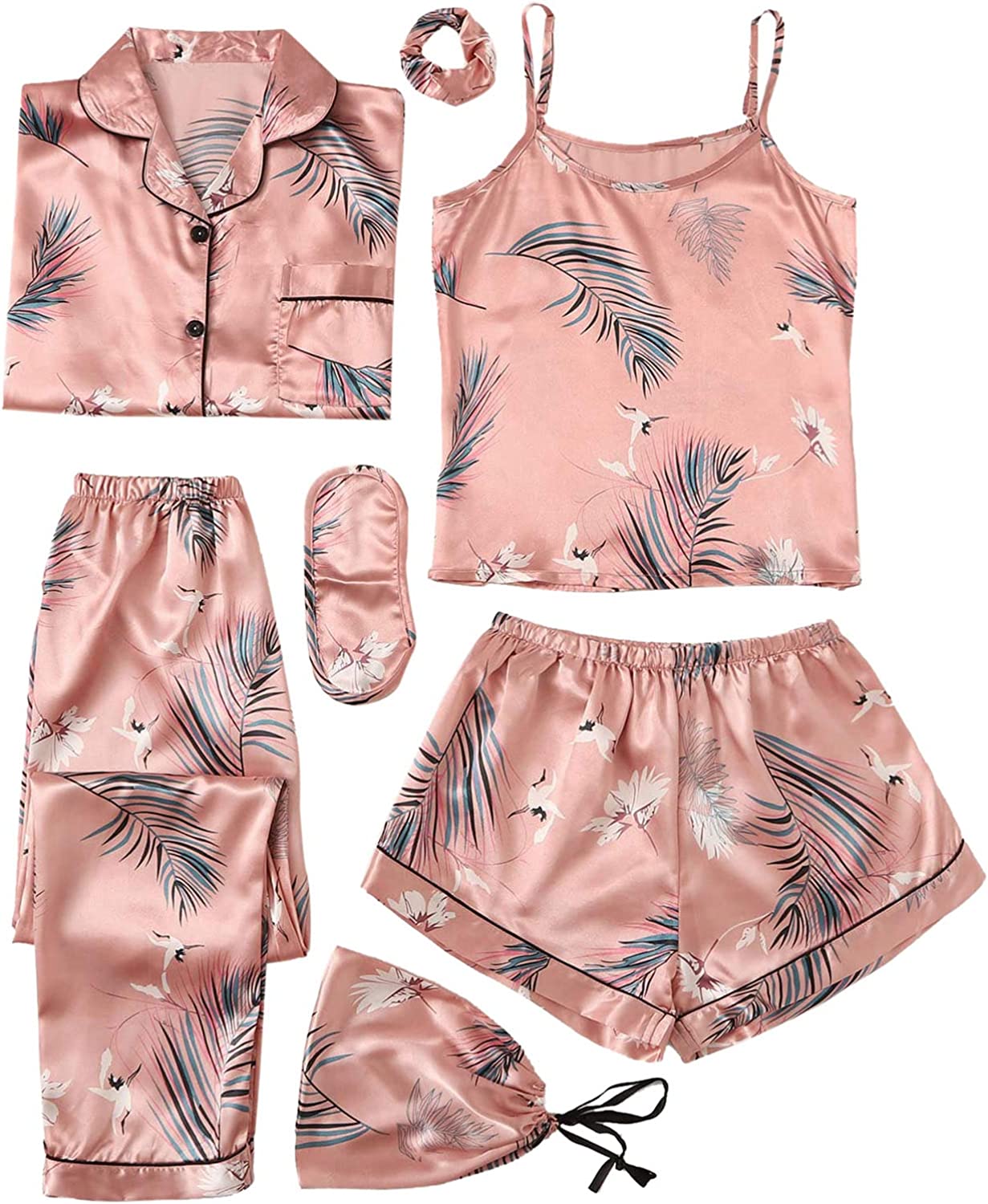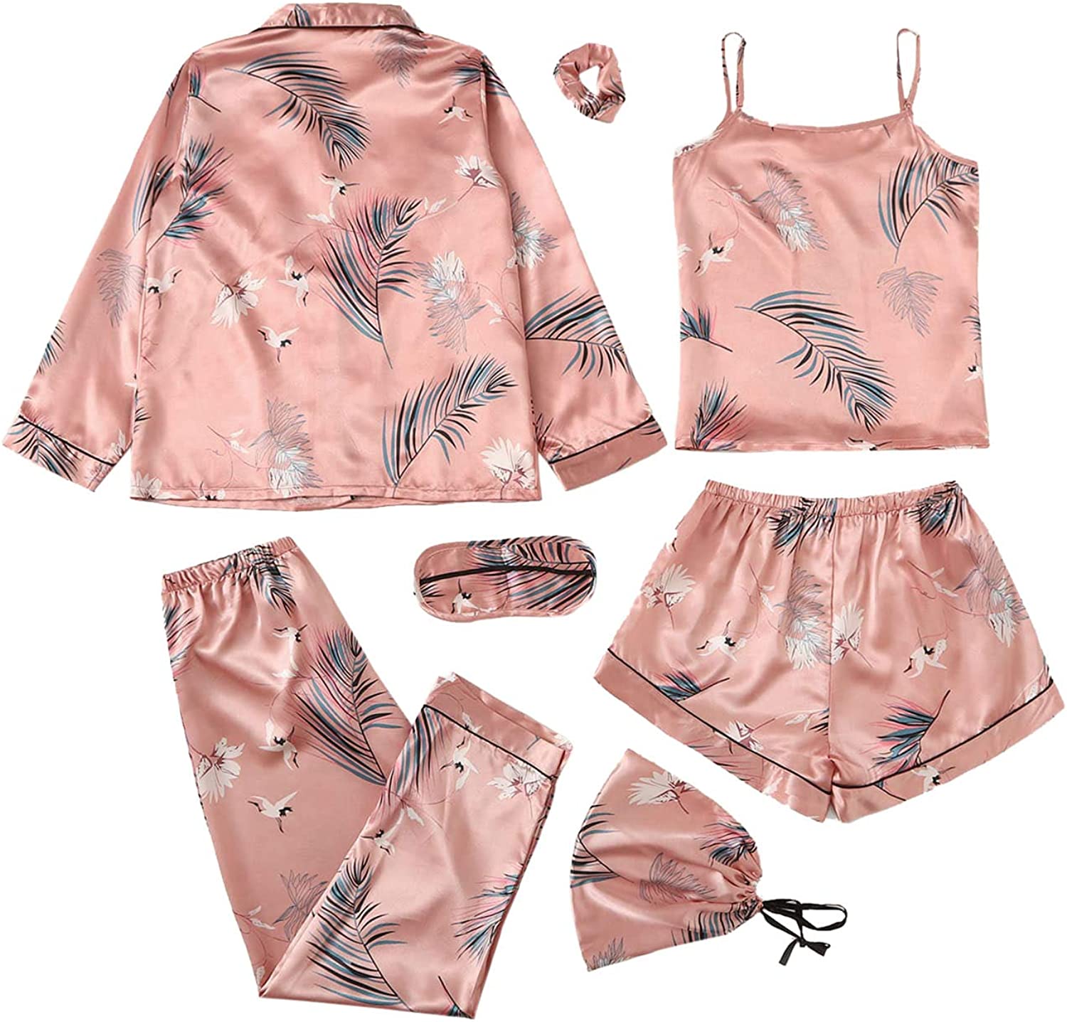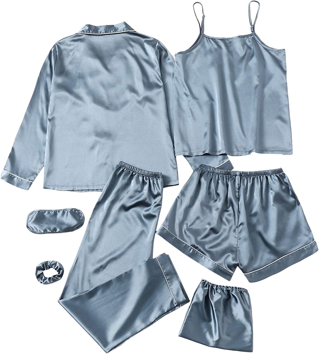 SheIn Women's 7pcs Pajama Set Cami Pjs with Shirt and Eye Mas