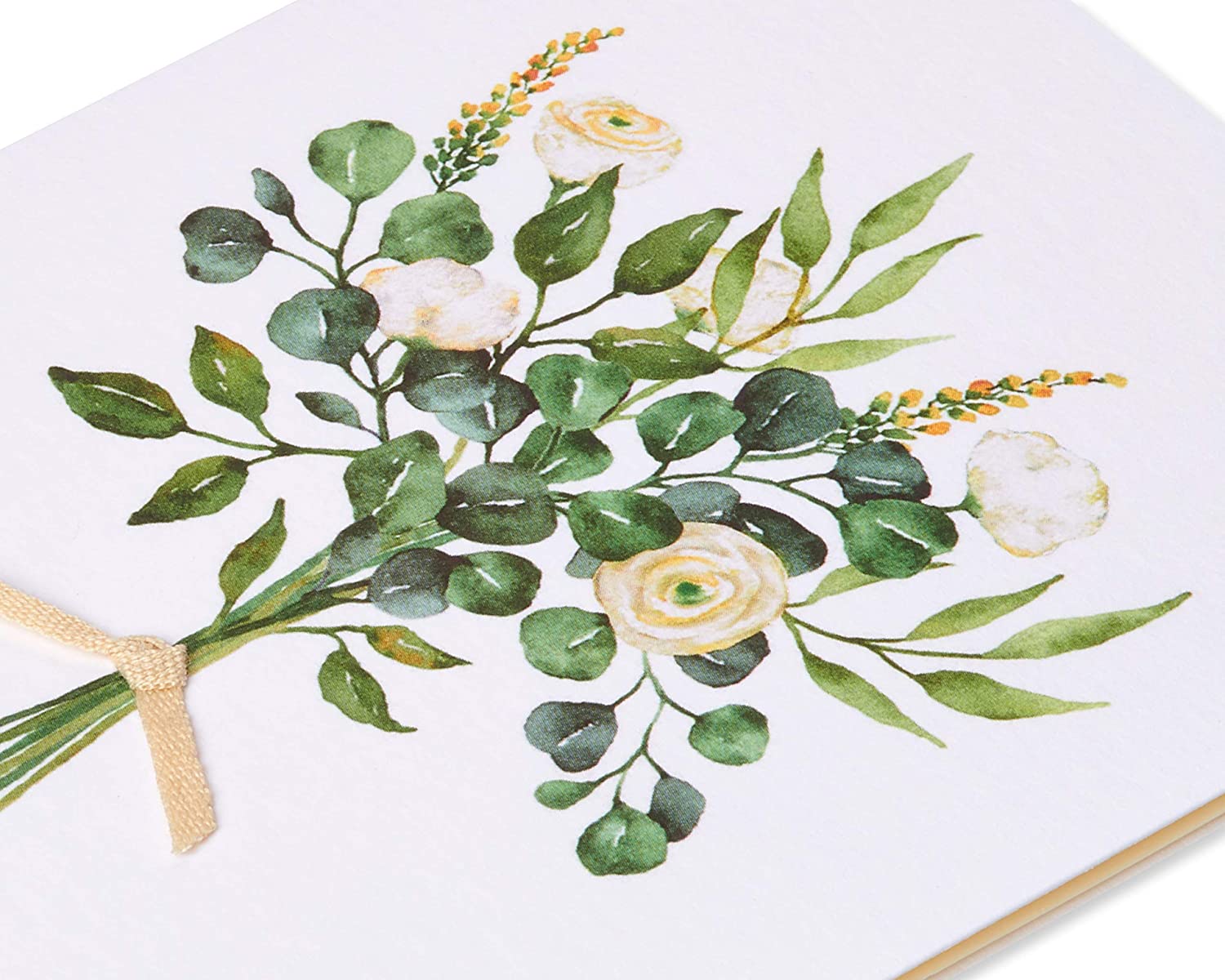 Share special wedding congratulations with a beautiful card by Papyrus! This elegant wedding design features a delicate, hand-painted floral bouquet in soft white and green tones with shimmering metallic foil accents against a crisp white background. The message inside is simple yet heartfelt, with enough space to write a personal message. Wish the happy couple all the best and let them know how much they mean to you with this elegant card only from Papyrus. Card includes matching envelope and gold foil seal.