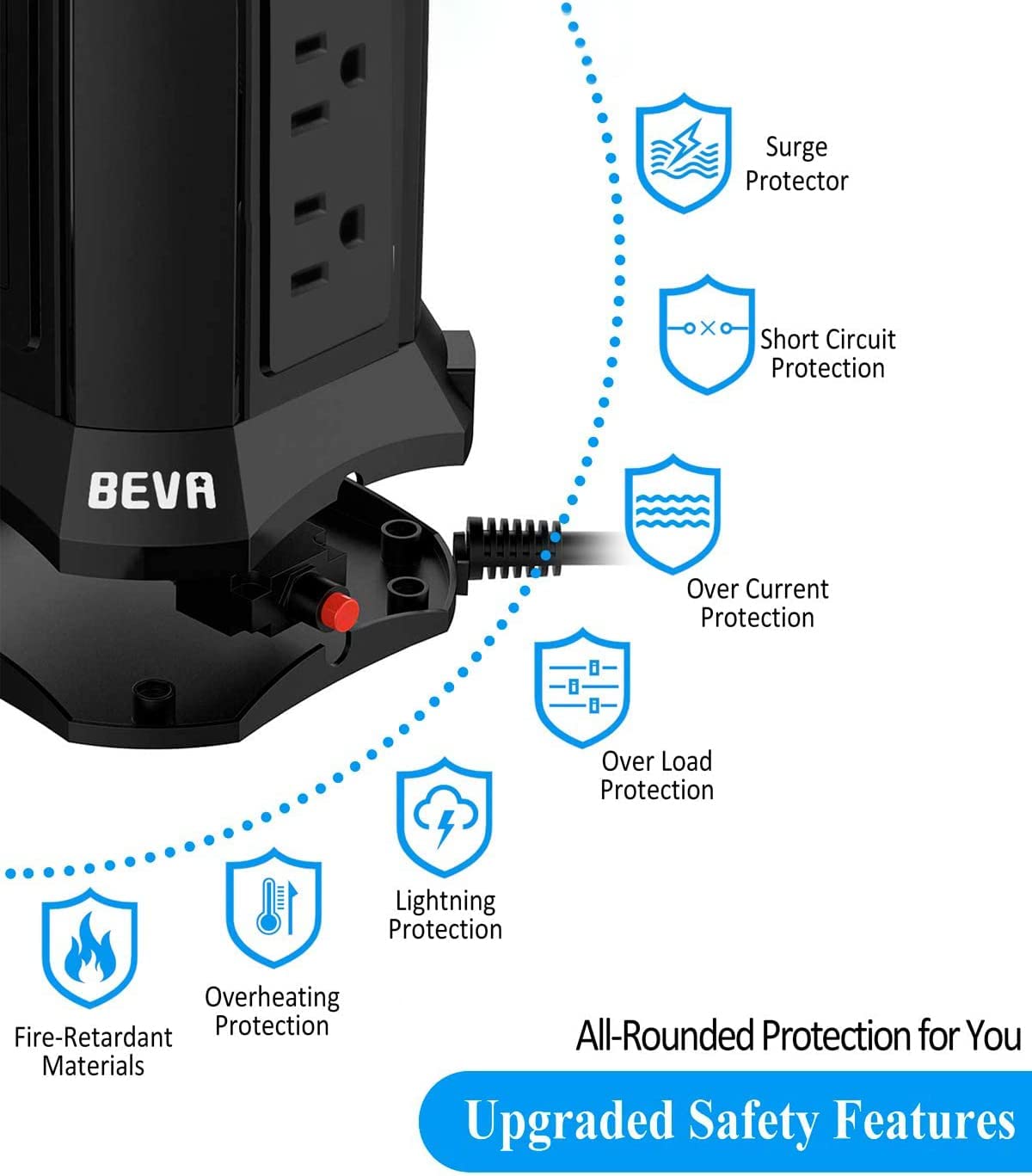 【All-Round Protected Surge Protector】- FCC, CE, RoHS certificated. A single power strip tower with surge protection(900 Joules), over-current protection, overload protection, circuit breaker and lightning protection, gives your electrical appliances an all-rounded protection. Its exterial shell is made of ABS + PC fireproof materials, which can withstand temperature up to 1382℉(750℃). Give your household electronics a safe & reliable power source.
