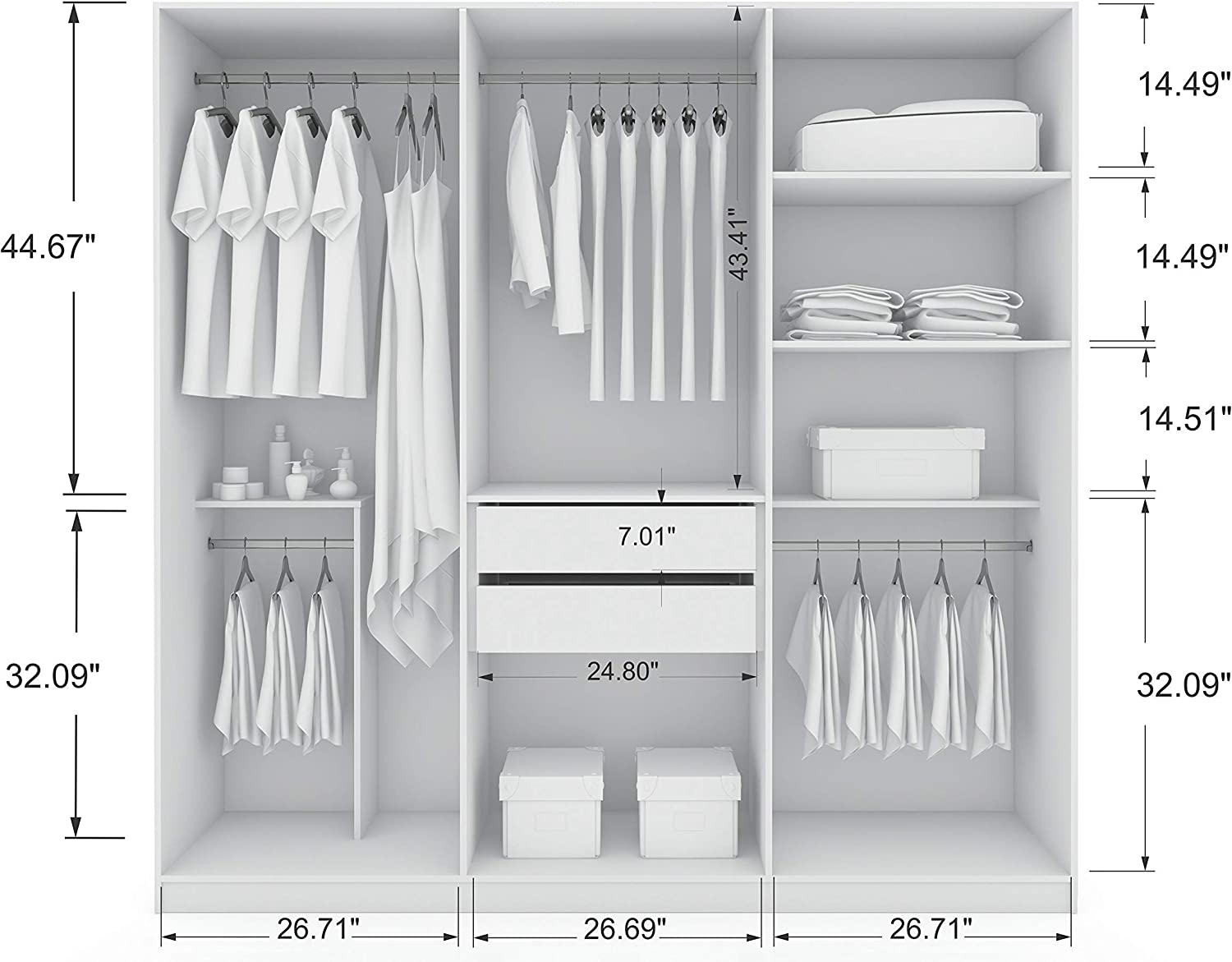 Features Very Ample Storage with Rods for Short and Long Clothes, Plus Shelves and Center Drawers. Store Your Entire Wardrobe Inside.