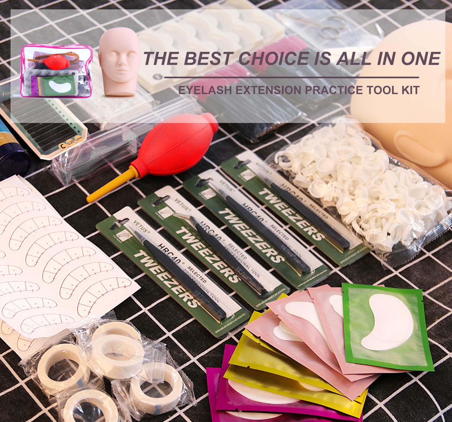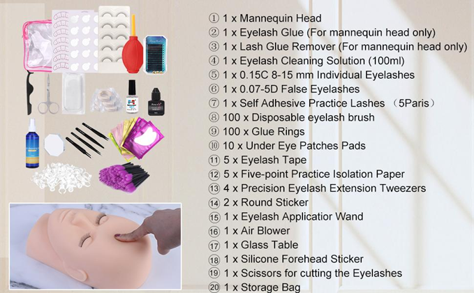 • ? THE BEST CHOICE IS ALL IN ONE - Mannequin Head, Disposable Mascara Wands, Glue Rings, Eyelash Glue (For mannequin head only), Tweezers, False Eyelashes, Air Blower, Eye Patches Pads, Silicone Forehead Sticker, Eyelash Applicatior Wand AND SO ON. The ultimate value packed kit!