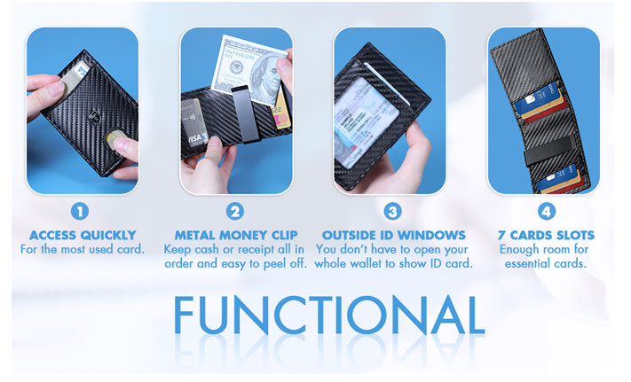 ULTRA SLIM & MULTIFUNCTIONAL - Best slim wallet that measures only 3.9"x2.76"x0.34". A men’s wallet with enough room for essential cards and cash without being bulky. Front pocket for the most used cards for quick access. Outside pocket for ID cards so you don’t have to open the whole wallet