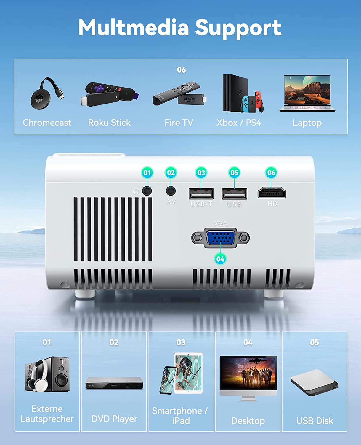 【CONNECT TO ANY DEVICE】This outdoor projector works with a wide range of devices including TV sticks, PCs, laptops, tablets, Blue-ray DVD players, TF cards, USB flash drives, PS4/XBOX/WII, media players (music, pictures, video, TXT), and headphones. You can even connect it to your iPad, iPhone, or Android smartphone (additional HDMI adapter required). Not recommended for PPT business presentations.