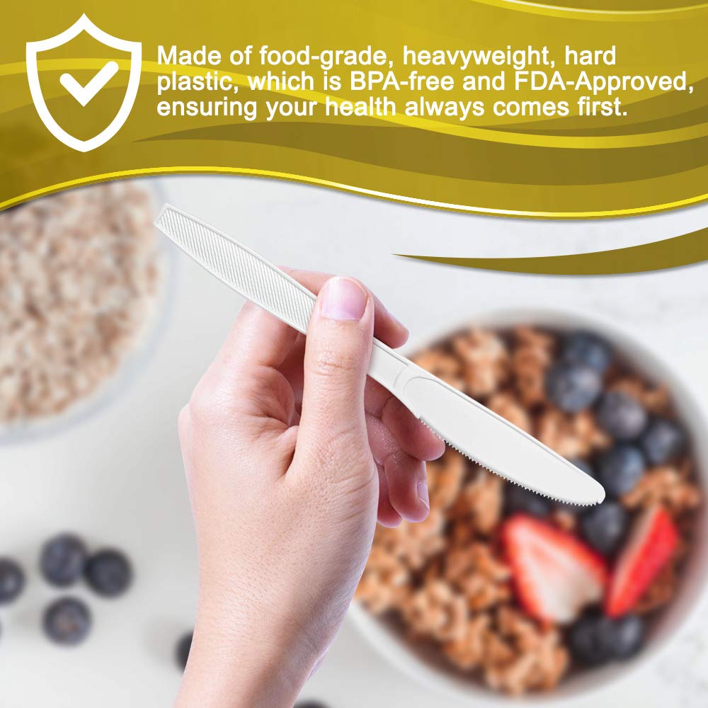 EXTRA HEAVY WEIGHT CONSTRUCTION- Heavy duty, disposable, plastic knives. The heavyweight plastic construction is made of food-grade plastic that is very sturdy, and ideal for solid foods like steaks, salads, fish, corn and more.