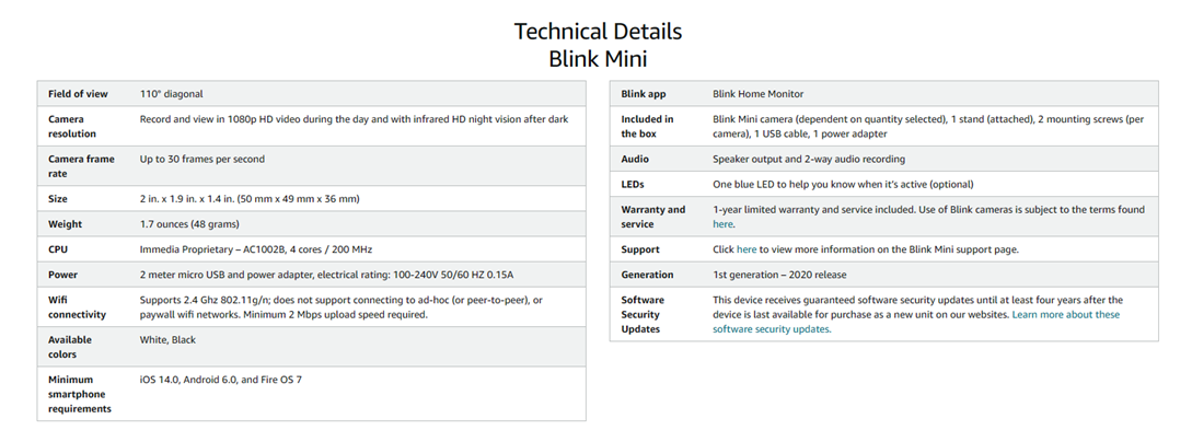Works with Alexa — pair Blink Mini with a supported Alexa-enabled device to engage live view, arm and disarm your camera, and more using your voice.