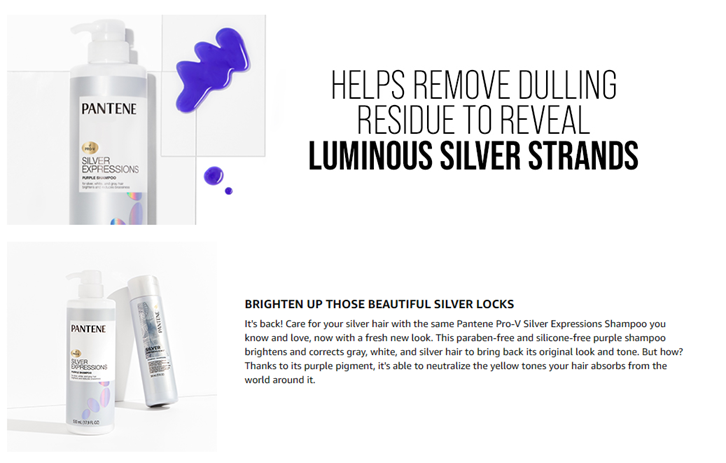 Want more silver and less gold? The Pantene Pro-V Silver Expressions Purple Shampoo you love is back with a brand new look. This purple-pigmented cream reduces dullness*, giving you a brighter, more toned look. Purple can color-correct or neutralize excess yellow, bringing back your original tone. After youve finished blaming sunshine, pool time, and even your tap water for adding brassiness, pick up your purple shampoo. It works wonders for gray, white, and silver hair. Lather up daily, or as you see fit, always making sure to leave it in for 3-5 minutes for the best results. Meanwhile, enjoy the luxurious scent of lotus flowers. Now you're on your way to another #greathairday.