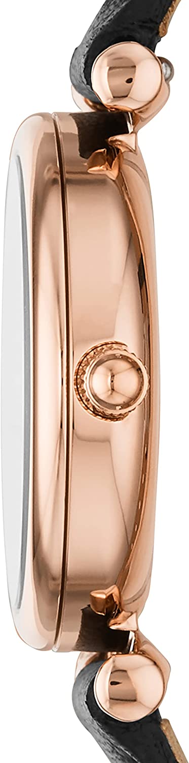 - Rose gold-tone stainless steel case with black mother of pearl dial; genuine black leather band with adjustable buckle closure; interchangeable with all 12mm Fossil straps