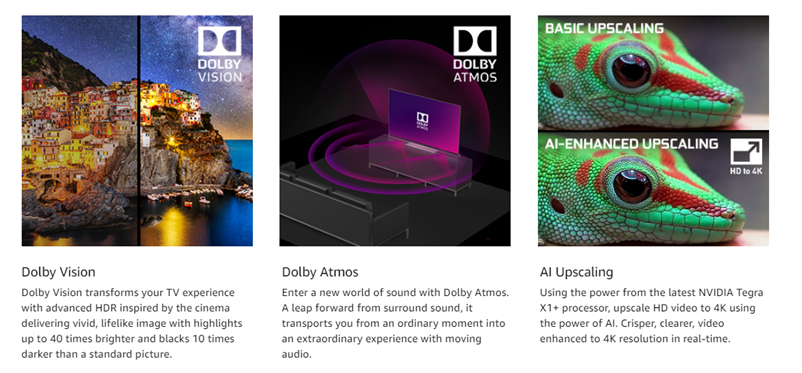 - Dolby Vision - Atmos. Bring your home theater to life with Dolby Vision HDR, and surround sound with Dolby Atmos and Dolby Digital Plus—delivering ultra-vivid picture quality and immersive audio