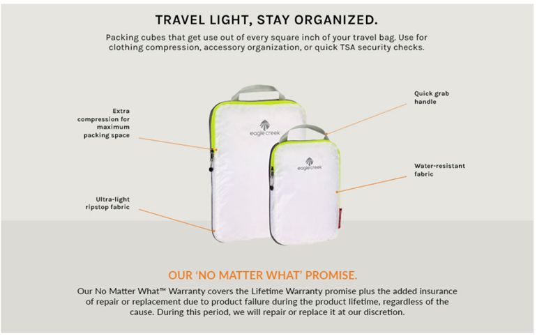 - NO MATTER WHAT WARRANTY - Eagle Creek's Warranty covers the Lifetime Warranty promise plus the added insurance of repair or replacement due to product failure during the product lifetime, regardless of the cause