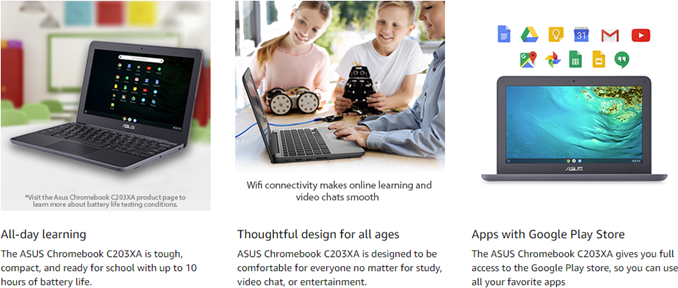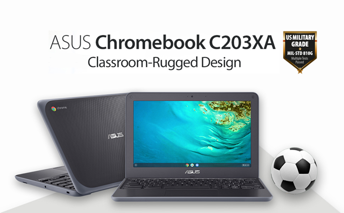 ASUS Chromebook C203XA is built with military-grade standards, as well as a rubber bumper, and a spill-resistant keyboard that withstands knocks bumps drops, and spills. This compact 11.6-inch Chromebook gives you day-long battery life. With the immense variety of apps on the Google Play Store, ASUS Chromebook C203XA is the perfect companion for study and play.