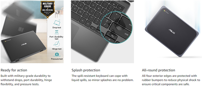 • Rugged body with military-grade durability, a spill-resistant keyboard, and anti-scratch for the perfect Chromebook for the classroom or any accident-prone environment.