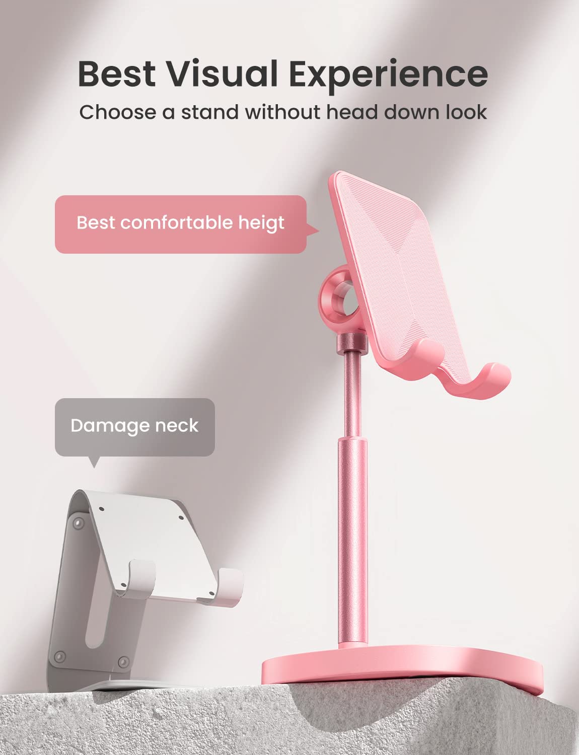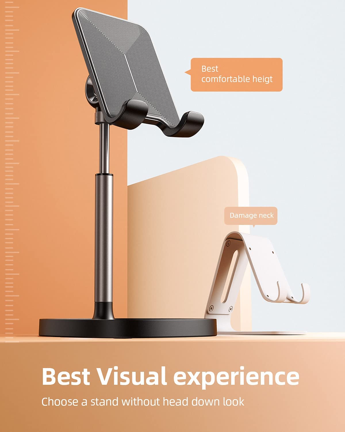 TALLER AND MORE PHOTOGENIC STAND, HELP TO CORRECT THE "TEXT NECK": This cell phone stand holder is in accordance with ergonomic design. Providing you comfortable viewing angle which helps to fix your posture and reduce neck & back strain. The height can be easily adjusted between 7.1in-8.5in(1.4in adjustable range), the angle is adjustable between 5°~85°