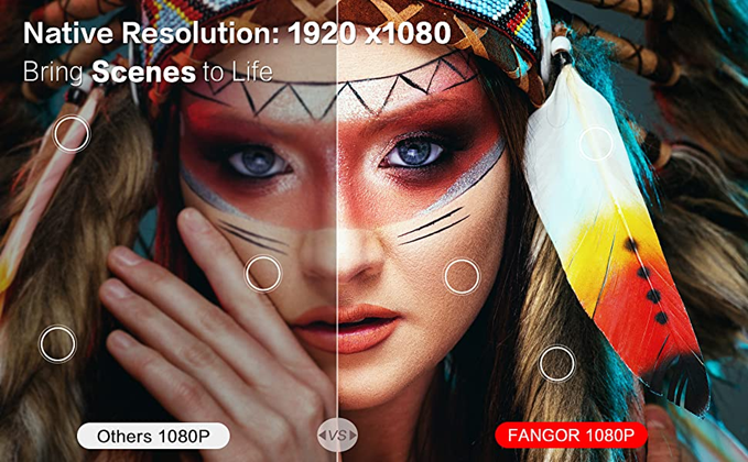 FANGOR F506 Native 1080P Projector with a true 1920 x 1080 Resolution, It delivers bright large-screen with fantastic image clarity, outstanding color accuracy and incredibly sharp image detail to both homes and businesses.