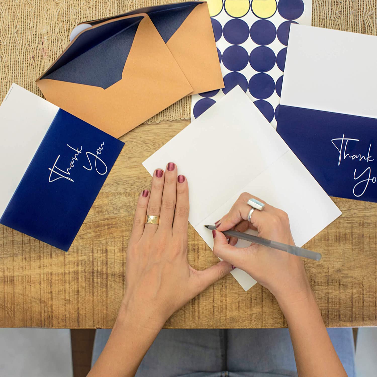 - ✔️ CLASSY DESIGN FOR ANY OCCASION: Each box set of 100 thank you cards come with matching lick-to-seal sturdy kraft envelopes with a blue interior lining as well as a matching themed sticker to seal the envelope and tie it all together. Be sure to always have a pack of greeting cards on hand, whether you need to thank a friend, send a special note, or make some staff appreciation cards!
