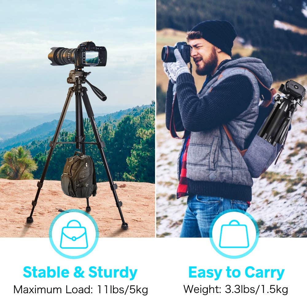 • 【Wide Compatibility】This camera tripod has a sturdy phone holder and 1/4 Universal Screw. And it can extend from 20.87 to 74in, this tripod fully for All Cameras(Nikon D3500/D7500, Canon m50 EOS rebel t6 t7, Olympus, Panasonic).