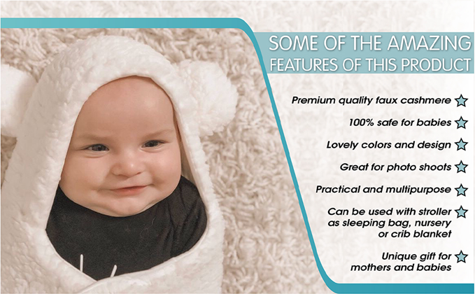When it comes to your newborn’s comfort and safety there’s no room for compromise. If you want to make sure he falls asleep having that cozy, warm feeling, this swaddle blanket is definitely the right choice! Why is this product for you? Made from superior quality, ultra-soft material which feels great against their sensitive skin, this sleeping sack is a must for every mother! Your little one will feel comfortable and safe anywhere, from a walk in the stroller, in his crib or nursery room. The cute unisex design is perfect for baby shower or gender reveal party gifts! Some of the amazing features of this product: Premium quality faux cashmere; 100% safe for baby; Lovely colors and design; Great for photo shoots; Practical and multipurpose; Can be used with stroller, as sleeping bag, nursery or crib blanket; Unique gift for mothers and babies. ADD TO CART NOW and you’ll fall in love instantly with this lovely swaddle blanket!