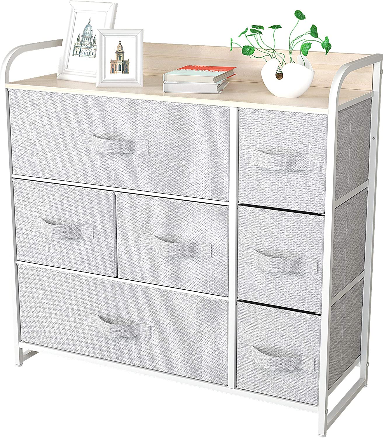 QUALITY CONSTRUCTION- Made of reliable metal frame and durable MDF wooden top; 7 removable and foldable drawers; Easy pull fabric handles help conveniently open and close the drawers; 4 adjustable plastic feet help protect your floor from scratches.