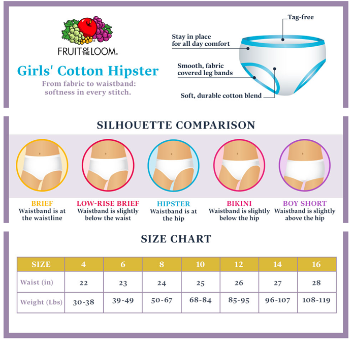 This hipster is designed with breathable, 100% cotton and comfort-covered fabric waist and leg bands that help to stay in place for all day comfort. The silhouette features a waistband that sits at the hip, lower cut legs, and offers Mom-approved coverage. This assortment includes a combination of cute prints and fashionable solids that are sure to make these hipsters her new favorites. Offering a fun, colorful way to meet your basic clothing needs, these hipsters come in a wide range of sizes making it easy to find the perfect fit for her. As always, our Fruit of the Loom girls’ panties are made tag free and with a 100% cotton liner for extra softness.