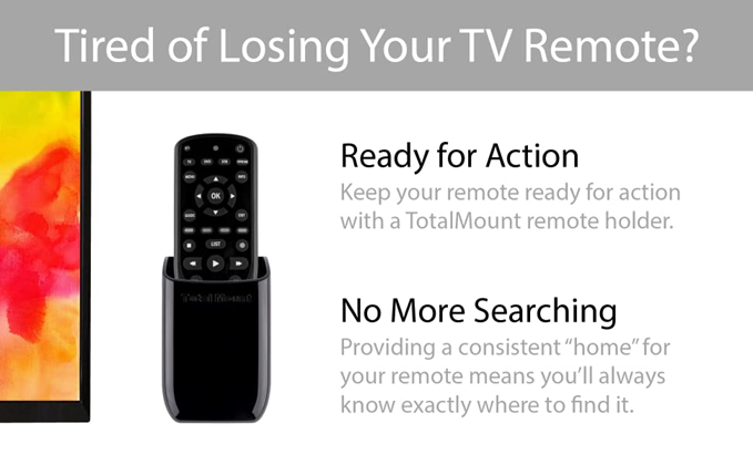 If you are tired of searching for your TV remote, then this remote holder is for you. This patented TotalMount is made by the trusted leader in electronics mounting. The remote holder attaches to walls with removable adhesive.