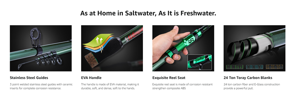 - The Exquisite Fishing Reel Seat Is Made of Corrosion Resistant CNC Machined Aluminum for a solid base and all-day; EVA handles are comfortable, durable and exceptionally slip resistant giving you maximum control over your fishing rod in all conditions.