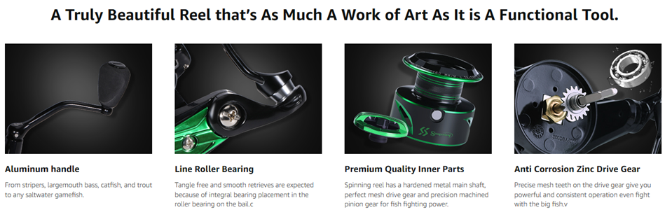 - Spinning Fishing Reel With CNC Machine Cut Collapsible Handle, Left / Right Interchangeable, 12+1 Corrosion Resistant Smooth Ball Bearings.