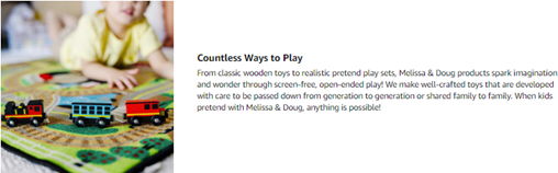 From classic wooden toys to crafts, pretend play, and games, Melissa & Doug products provide a launch pad to ignite imagination and a sense of wonder in all children so they can discover themselves, their passions, and their purpose.Since the company’s founding more than 25 years ago, Melissa & Doug has consistently delivered innovative products that inspire open-ended thinking, encourage kids to see new possibilities, and offer Countless Ways to Play. It’s part of a bigger vision to Take Back Childhood. Because by giving children a true childhood with the space and freedom to explore their world, we give them a path to realizing their full potential!