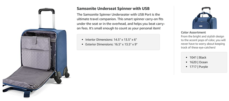The Samsonite Spinner Underseater with USB Port is the ultimate travel companion. This smart spinner carry-on fits under the seat or in the overhead, and helps you beat carry-on fees. It’s small enough to count as your personal item.