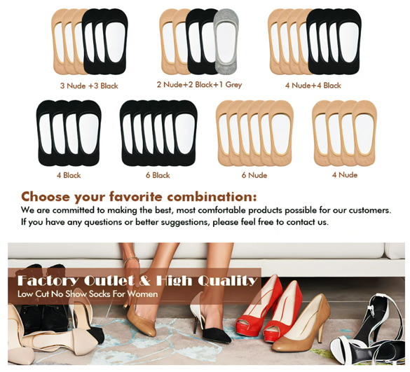 【Specially Designed for Women】The non-slip silicone at the heel prevents socks from slipping down.The low-cut shoe design makes it invisible. No show and non slip socks with basic colors, which are super suitable for a variety of lady's shoes, such as flats, heels, sneakers, and loafers.
