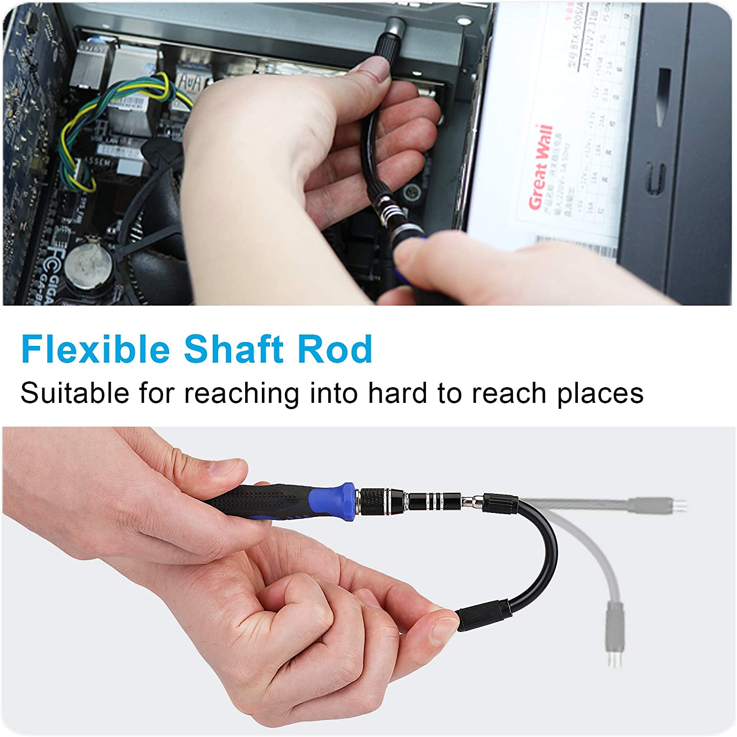 【Humanized Design】Ergonomic and press & push design handle, it is comfortable to hold even for the long-time use. Flexible Shaft Extension Rod and Solid Shaft Extension Rod with STRONG magnetic tips makes it easy to fix bit and pull screws out, a flexible shaft included is perfect for electronics where the shaft is hard to get, ideal for stereo work.